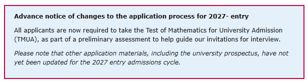 继上个月剑桥大学Christ's学院宣布增加TMUA考试后,目前最新消息,剑桥大学数学系要求所有27fall申请者必须参加TMUA!