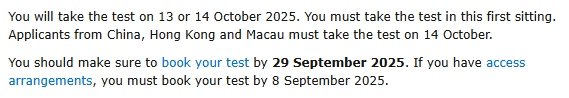 可参考2026Fall时间节点:必须在2025年9月29日之前报名成功,中国学生只能参加2025年10月14日的考试。(2026年报名时间待官网更新!)