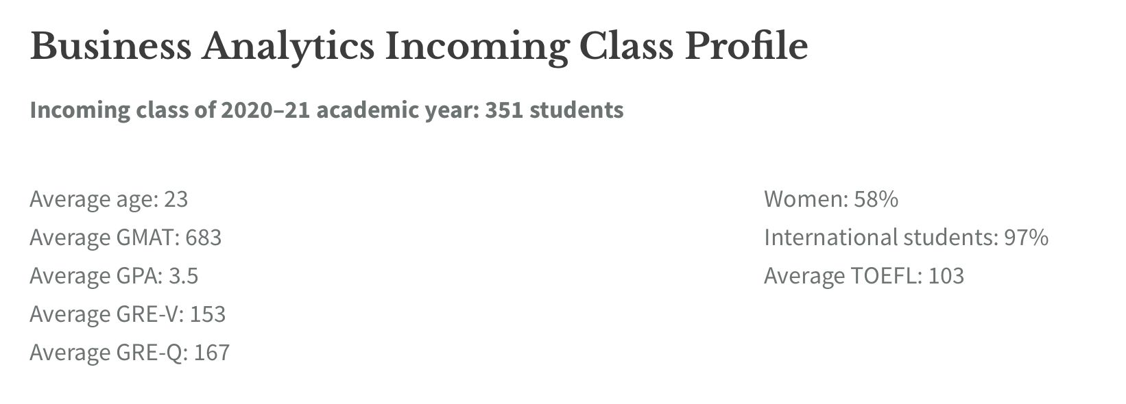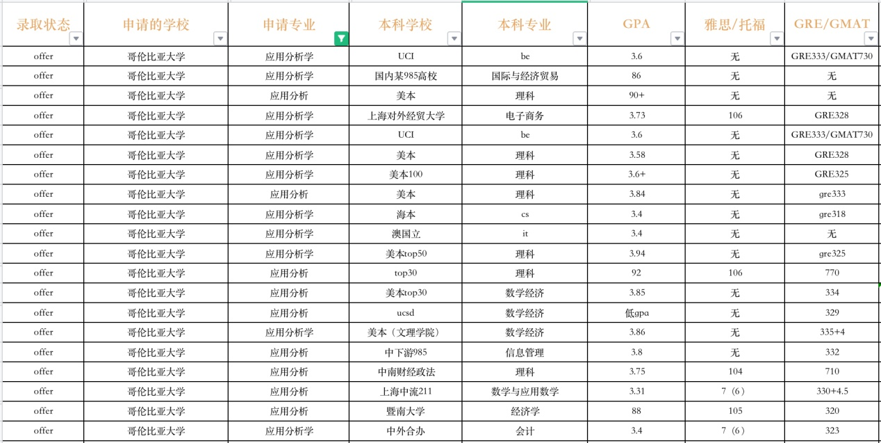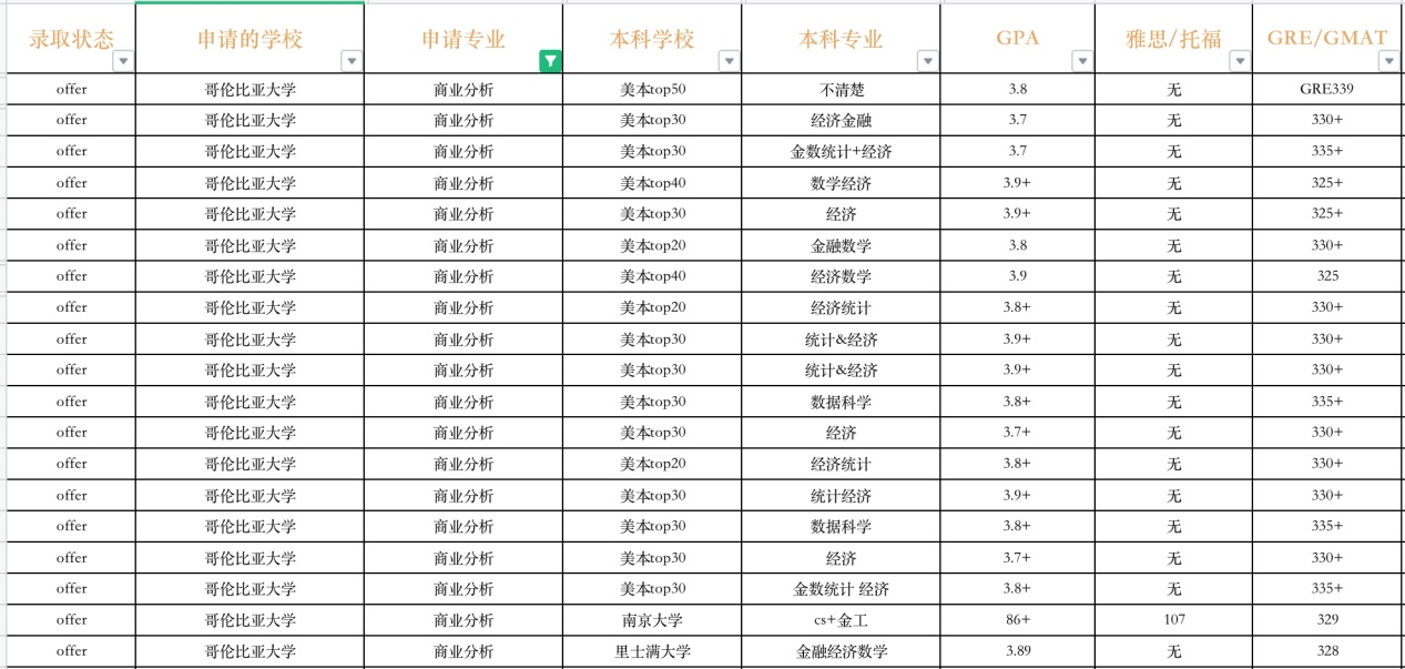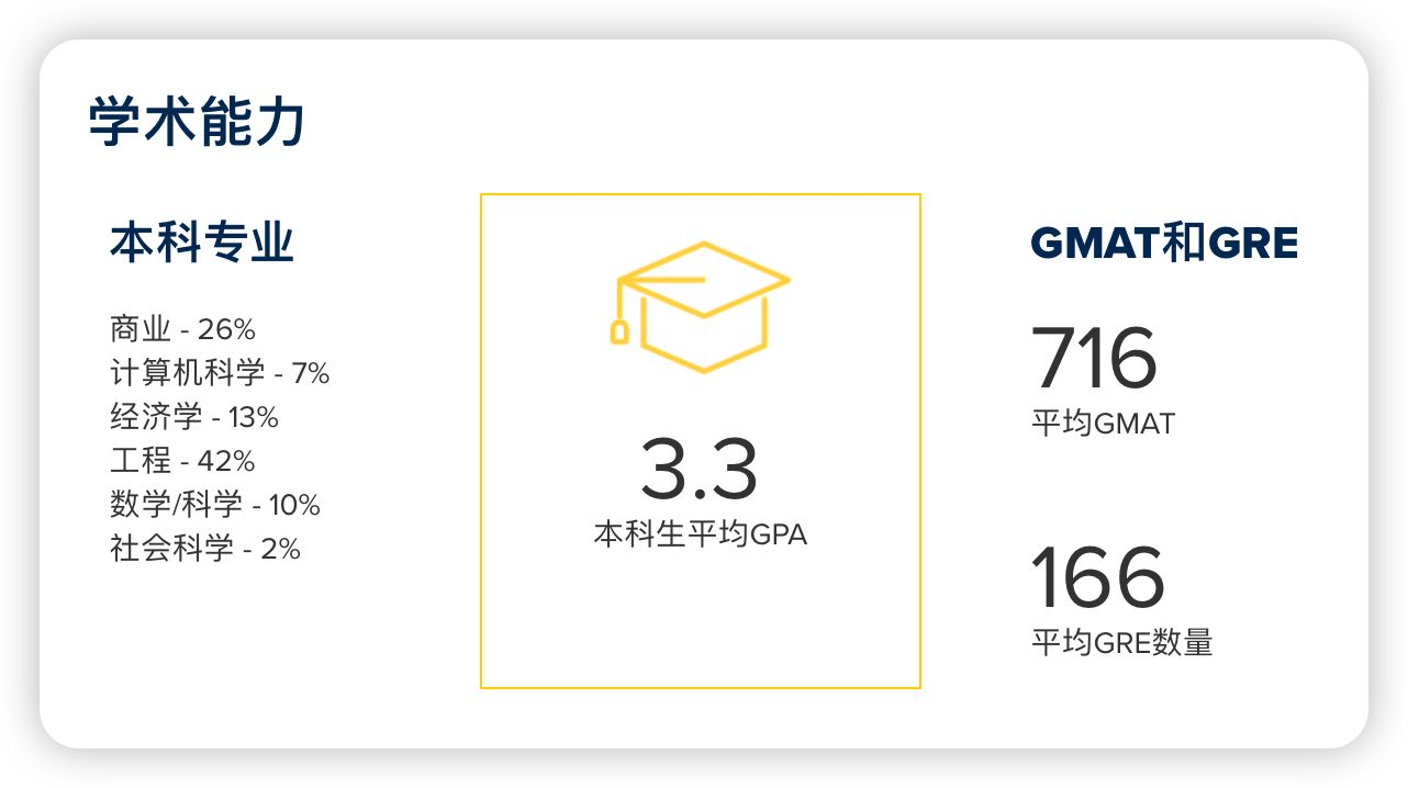 并不是开设在商学院下而是开设在SPS职业教育学院下面,所以难度相对于BA会降低一点,但近几年申请人数暴增使得录取门槛水涨船高,比如仍然是偏好海本和985/211并且GPA高的学生,纯商科学生可以考虑申请,虽然学校不强制要求GRE或GMAT成绩单从录取来看绝大部分申请人都必备课G类成绩。