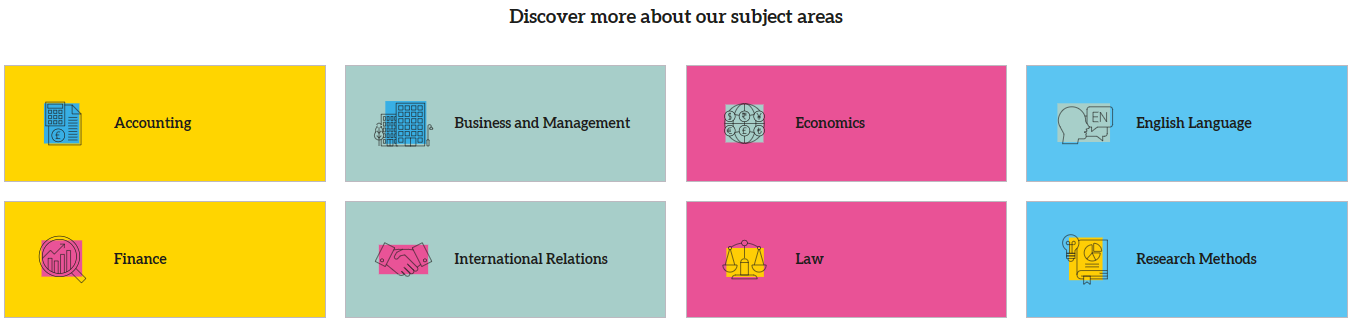 Accounting、Business and Management、Economics、English Language、Finance、International Relations, Government, Psychology and Society、Law、Research Methods, Data Science, and Mathematics