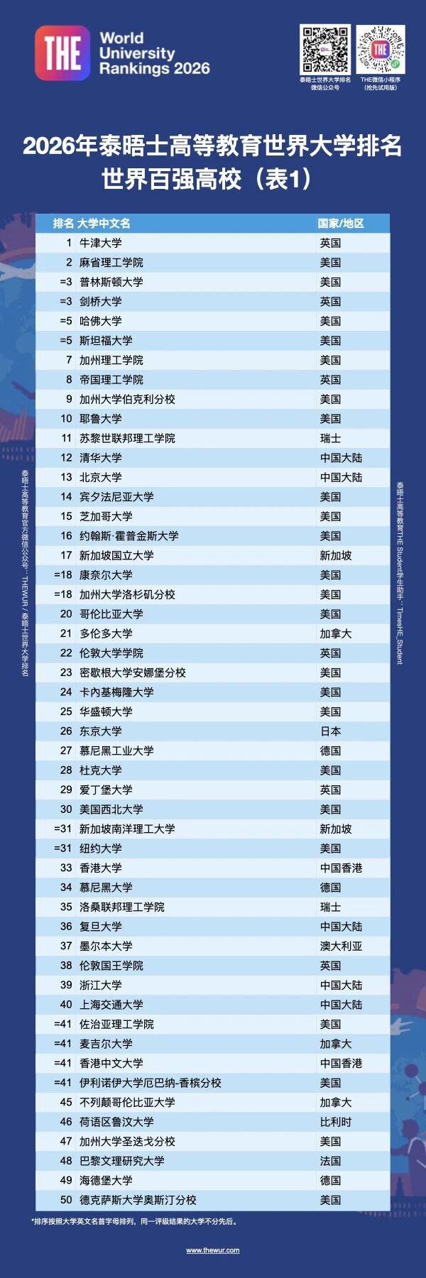 【重磅】全球高等教育研究机构泰晤士高等教育(THE)正式发布了2026年世界大学排名!这份被视为“世界三大大学排名”之一的权威榜单,再次搅动全球学术格局,牛津大学、哈佛大学、斯坦福大学等老牌名校依然稳坐第一梯队,而亚洲高校的崛起则成为本届排名最引人瞩目的亮点。
