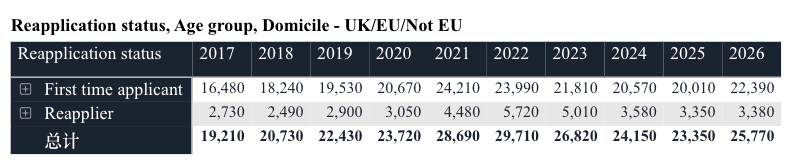 同时,UCAS也给我们总结了从2017年开始到2026年共十年的申请数据汇总: