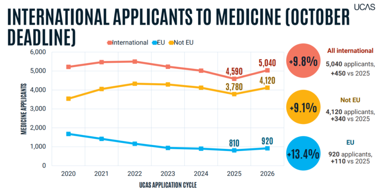 这一轮申请不仅反映了英本热度的强势回升,更揭示了几个关键趋势:国际生竞争加剧(非欧盟申请量激增12.9%)、医学类专业回暖(申请量增长10.4%),以及中国学生在激烈“内卷”中如何突围的挑战。