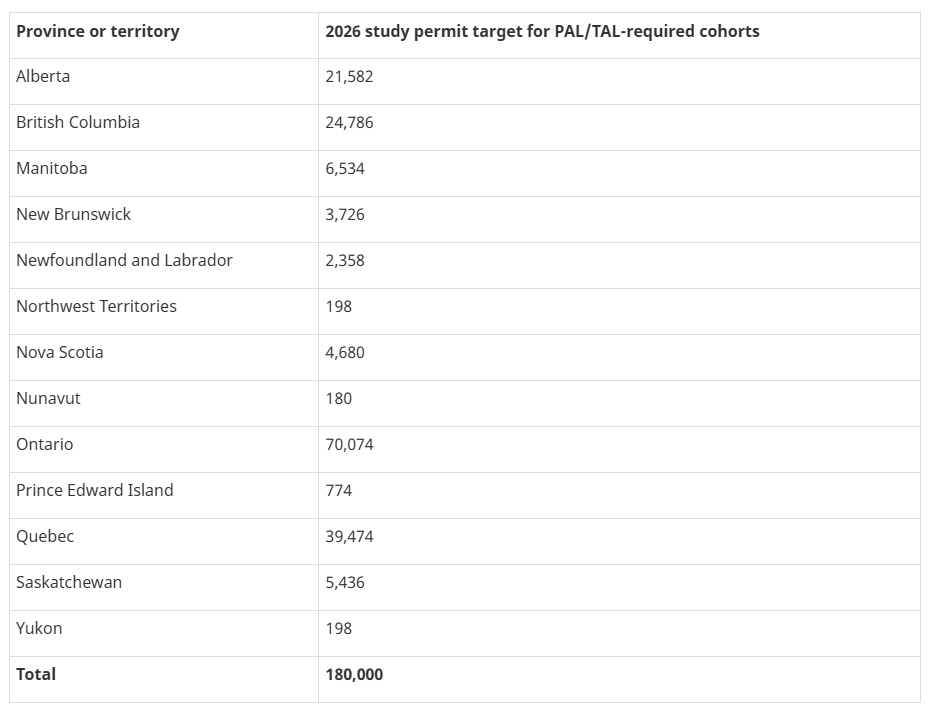 PAL/TAL要求的申请人(普通大专/本科):18万份被严格管控的“需要PAL/TAL”的学签,将按人口比例分配给各个省份。具体分布如下: