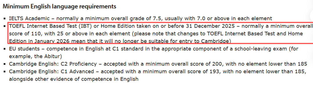 鉴于牛津、剑桥本科项目已公布新政策,自2026年1月起改制后的托福考试将不再适用于申请,建议各位同学尽早规划,优先选择雅思学术类考试——它仍是目前绝大多数院校普遍认可的语言成绩。