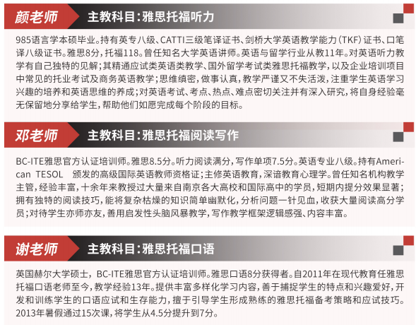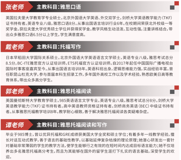(1)我中心老师均具有国内英语专八或国外3年以上留学经验; 具备5年及以上雅思、托福一线教研经验,我们的师资阵容强大,云集常年一线教学名师,洞悉考情,熟知规律,教学质量有保证。