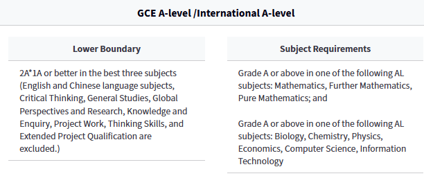 A-Level:需达到A*A*A及以上,其中数学、进阶数学或纯数学中任一科需达 A 及以上,且生物、化学、物理、经济、计算机科学或信息技术中任一科需达 A 及以上;
