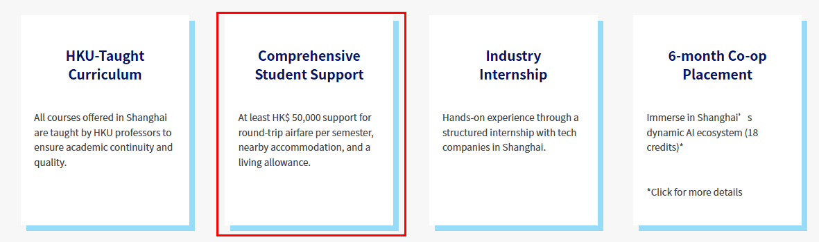 每学期可获得至少 5 万港元的综合资助,涵盖学生往返费用、住宿与基本生活津贴。
