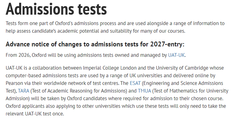 从2026年起(2027 entry),牛津大学将启用由UAT-UK(伦敦帝国理工学院与剑桥大学合作项目)研发并管理的入学考试,目前已被英国多所大学采用。届时,牛津大学申请者需通过以下考试满足所选课程的入学要求:ESAT(工程与科学入学考试)、TARA(入学学术推理测试)和TMUA(大学入学数学测试)。