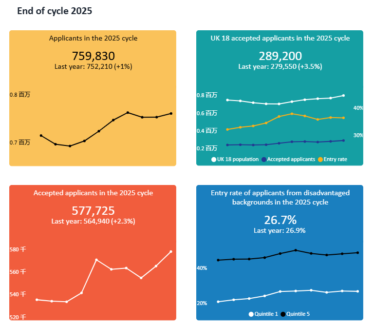 2025Fall,UCAS中共有759,830名申请者递交英本申请,同比增长1%,共577,725名申请者获得offer,同比增长2.3%。