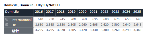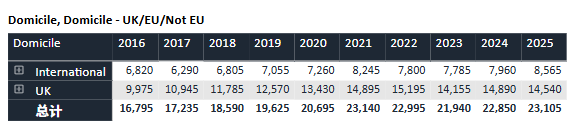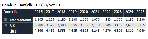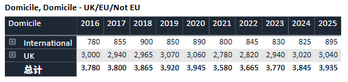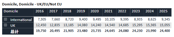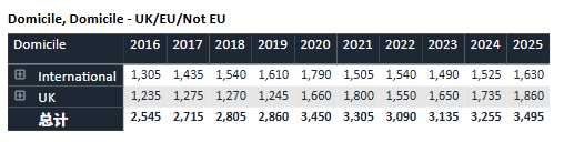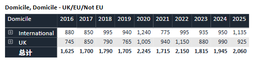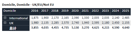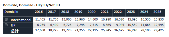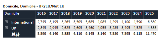 回顾过去十年数据,牛津的申请热度持续攀升。录取名额则始终保持“高冷”姿态,近十年基本稳定在3,300人上下。与此同时,整体录取率从2016年的约19%逐渐下滑至近年约16%的水平,可谓“入场券”越来越难抢。