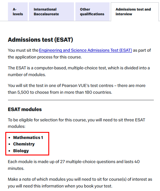 ESAT 是由剑桥大学与帝国理工共同采用的入学笔试。ESAT采用机考形式,每张卷子27个选择题,限时考试 40 分钟。生命科学系的申请者通常需要完成以下三个指定模块: