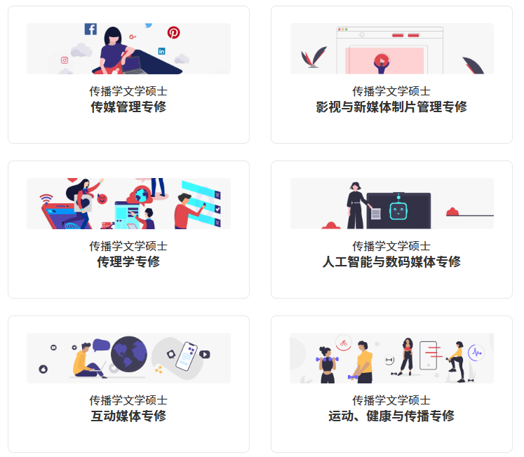 传播学文学硕士(6大方向) :方向涵盖传媒管理、互动媒体、影视与新媒体制片管理、人工智能与数码媒体、传理学、运动健康与传播