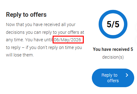 2026年5月6日:如果在3月31日前收到所有申请的结果,需要在5月6日之前做出回复,选择志愿。(处于 Extra 补申阶段的申请者除外)
