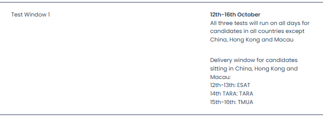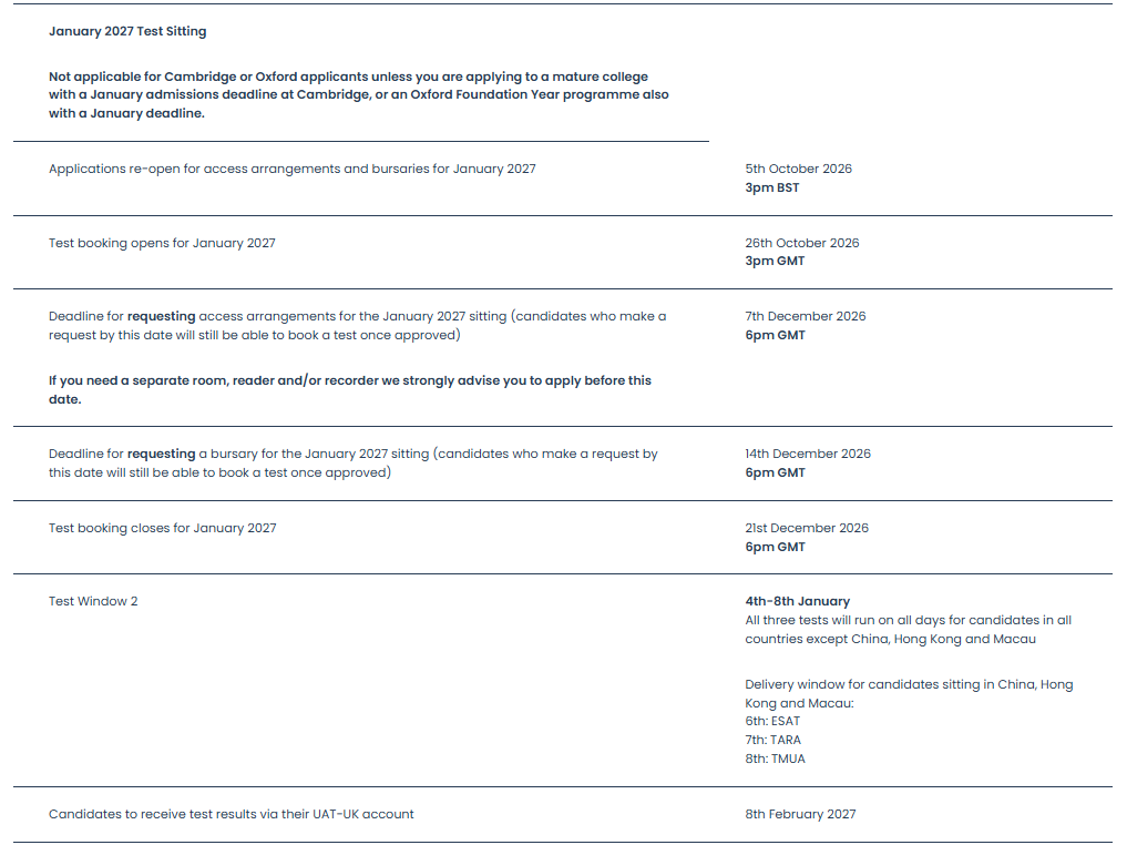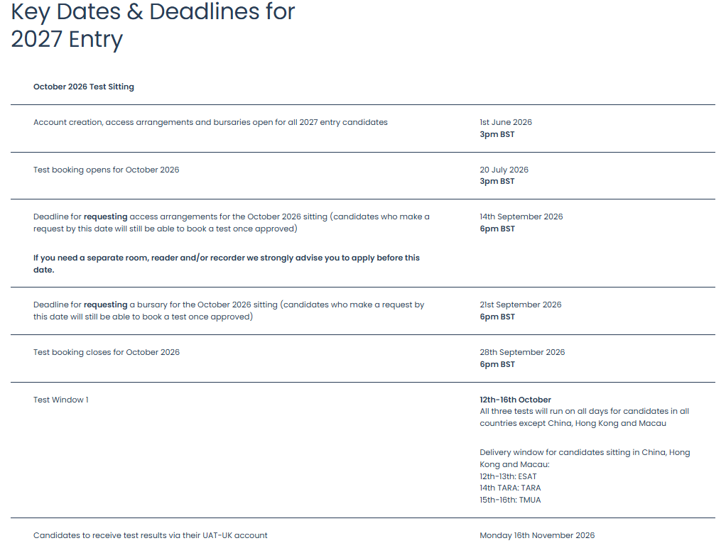 2027申请季的ESAT/TMUA/TARA笔试时间正式公布,考试将在2026年10月和2027年1月分两轮举行。今年的安排有两大核心变化:考试天数大幅增加,且中国区考生的选择权明显提升。