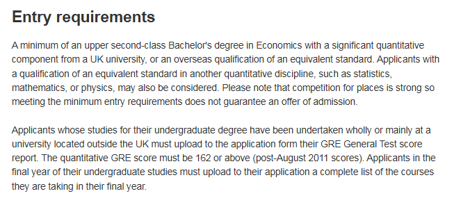 MSc Economoics专业明确要求提供GRE成绩,并且Quant部分不得低于162分。