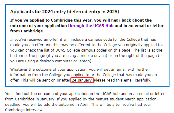 剑桥每年基本都在1月底放榜,具体日期也因各学院而不同。今年,剑桥大学的放榜日定在了2024年1月24日,但不同学院的邮件通知时间可能会有先有后。无论申请结果如何,都将通过UCAS和电子邮件通知学生。