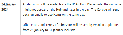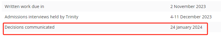 部分学院更新了放榜日信息,其他未更新的学院可以以此为参考。例如Trinity 学院,会在1月24日邮件通知申请结果。
