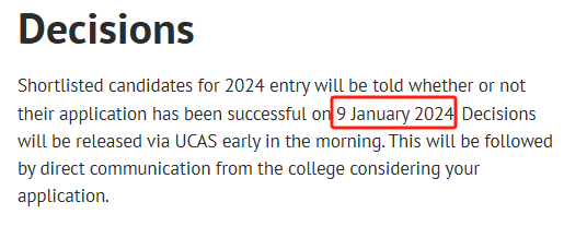 好消息,今年牛津大学又提前了放榜日!牛津大学在官网公布,将在2024年1月9日通过UCAS Track 发布录取决定,不管是录取结果如何都会通知学生。显然,笔试取消&重考并没有影响牛津的招生工作,今年的放榜日又提前了~