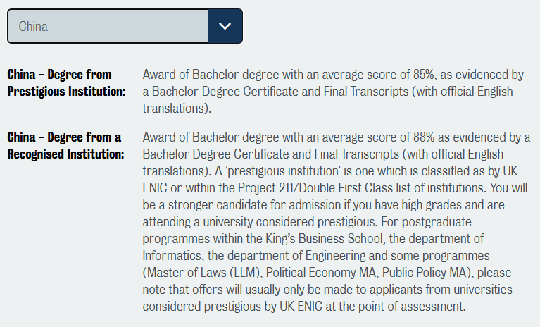 KCL将中国大学分为 Prestigious Institution(名校,根据UK ENIC划分)以及211大学,和 Recognised Institution(认可大学)。
