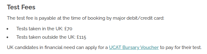 UCAT考试费用为:英国本土70英镑,其他地区115英镑。