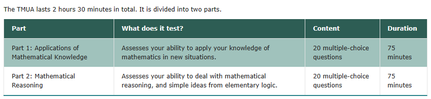 TMUA考试时长为2小时30分钟,考试仍然分为两个部分:每个部分均包含20道单选题,时间都是75min。