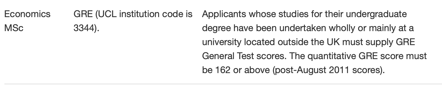 UCL相对是G5当中比较友好的啦,只有部分专业明确要求提供GRE成绩,如MSc Economics、Comparative Business Economics MA、MSc Finance专业。不过大部分商科专业都鼓励提交GRE成绩,如Comparative Economics and Policy MA、Business Administration MBA、Data Science and Public Policy (Economics) MSc。