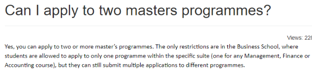 小编“偷偷”告诉你们,大部分英国院校都是可以同时申请两个专业的,小部分院校专业例外,例如华威大学WMG学院。不同院校的专业一般都是分开独立审核,不会轻易因为申请了两个专业就拒,也不会因为只申请了一个专业就“额外宽容”,最终还是要以学生的申请材料为准,尤其是文书的准备。