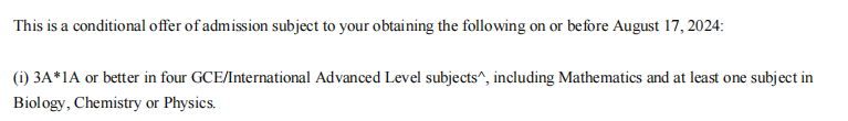 例如:C同学今年获得帝国理工学院的有条件录取,在已交基数A*成绩的前提下,要求另外三门A-Level 学科达到A*AA的水平。