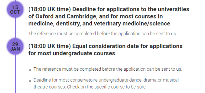英国本科申请一般是通过UCAS进行的,一般在9月就可以在UCAS中开始递交申请,牛津大学和剑桥大学2025Fall入学会在2024年10月15日(较2024Fall提前一天)截止递交申请,其余院校一般会在1月底截止申请,之后部分学校会安排笔面试。