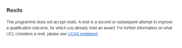 目前 UCL 不接受重考成绩申请的有 6 个学院,包括医学院(医学专业)、数院、统院、经济院、法学院、工程院(电子电气工程专业)。