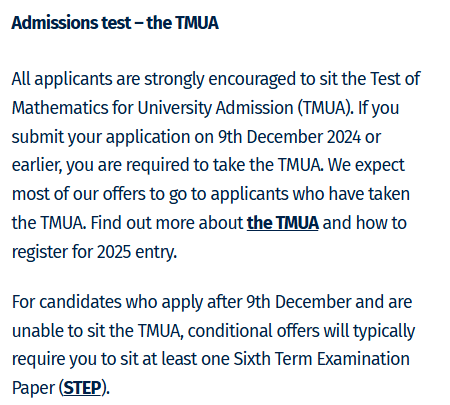 如果没有参加TMUA考试,会con学生STEP成绩。在12月9日之后提交申请且无法参加TMUA的候选人,有条件录取通知中将被要求参加并提交至少一场STEP考试。。
