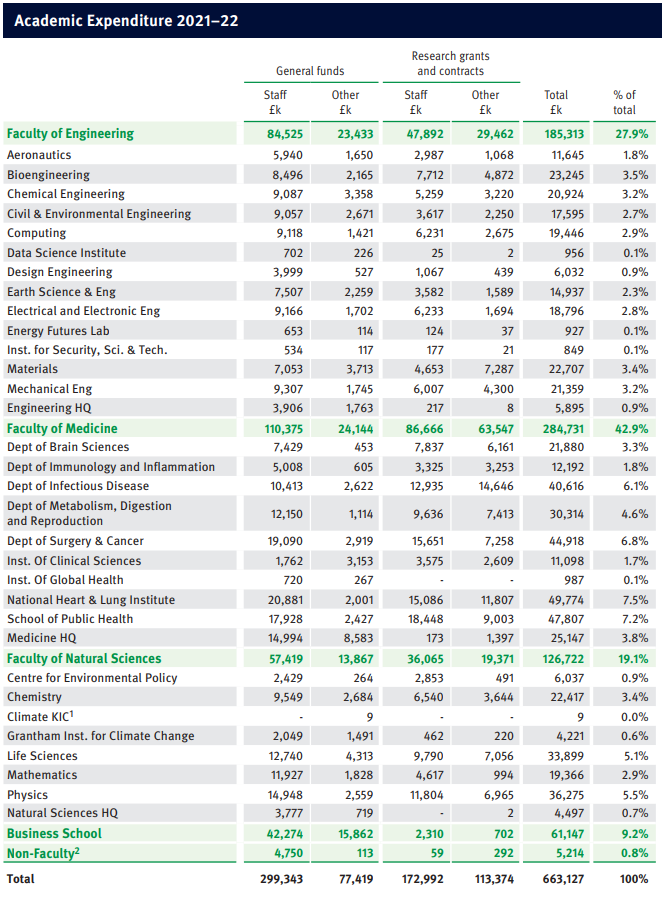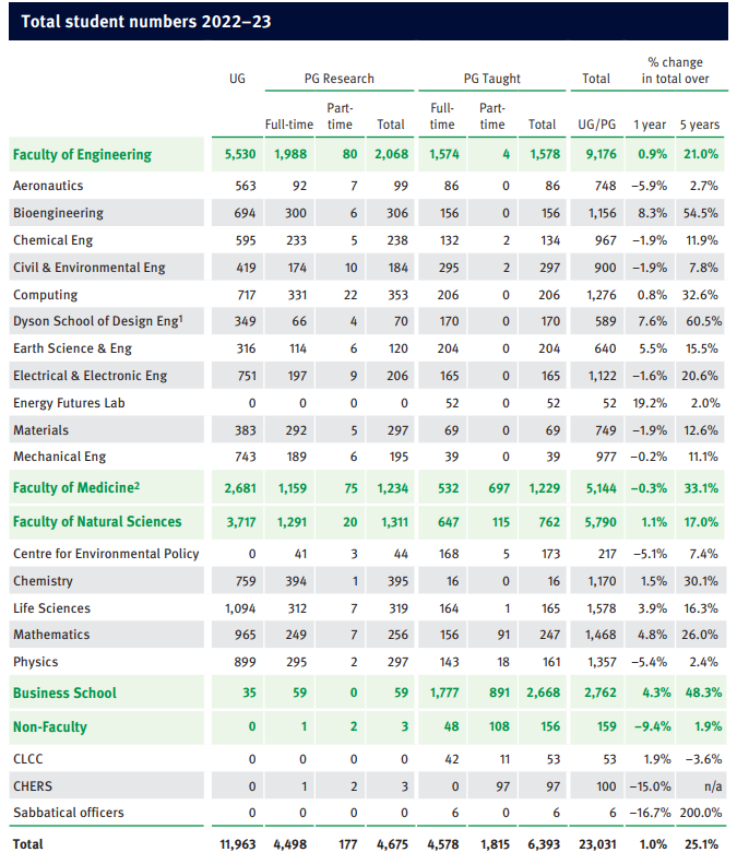 而近期帝国理工学院最近公布2022-23学年数据报告,涉及科工医商四大学院的学生人数、性别分布、入学人数、学生与教职工比例、申请与录取数据、学位授予情况、学术支出、研究拨款等信息。