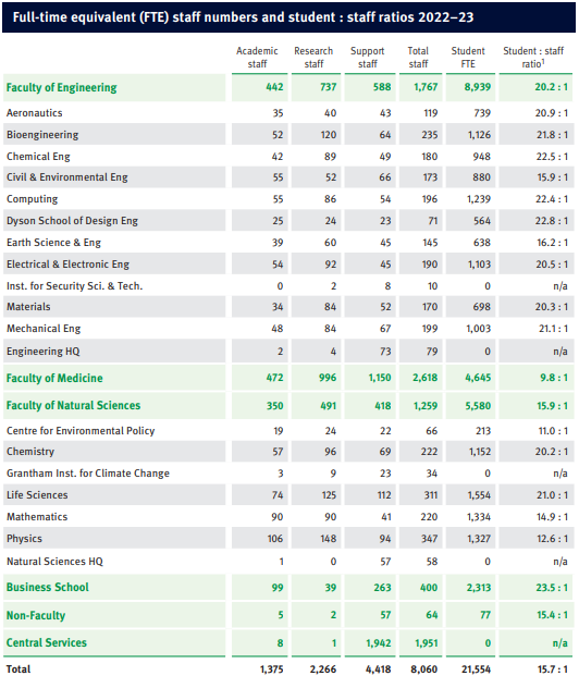报告中提供了帝国理工学院不同学院的师生比数据,这是通过学生与教职工的全职当量(Full-Time Equivalent, FTE)来计算的。师生比是衡量教育资源分配的一个重要指标,它反映了每个学生可以获得的教师资源量,直接关联到学生的学习体验和教学质量。四个学院中,师生比最高的学院是医学院,最低的商学院。