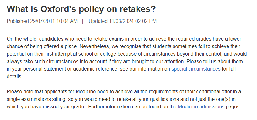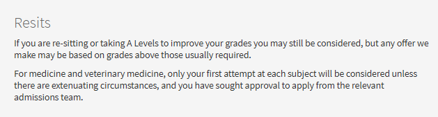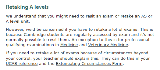 剑桥大学表达的很委婉,但大致意思是更偏向于没有重考经历的申请者。学校并没有明确区分resit和retake两种情况,但表示理解学生可能需要resit一个考试或retake一个AS或A-Level单元,但不要重考太多次。如果因为无法控制的情况需要多次重考,需要在UCAS推荐信和特殊情况说明表中详细说明,学校会进行综合考量。