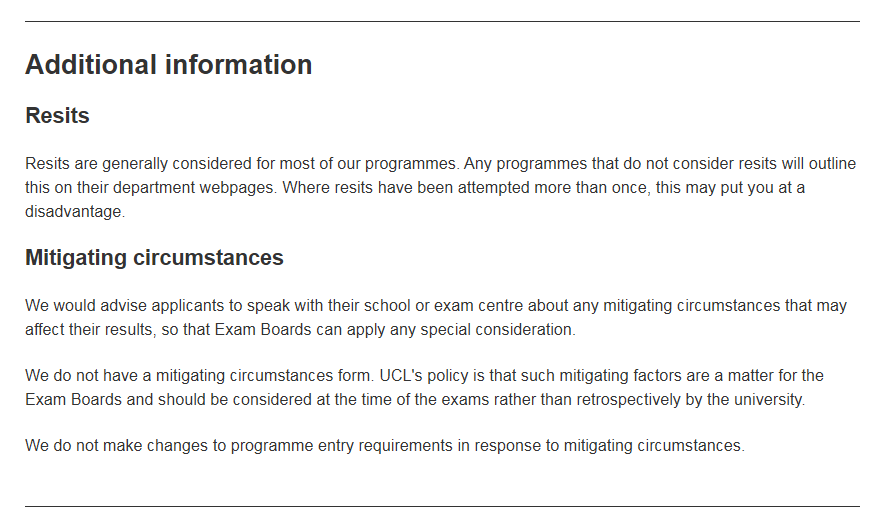 UCL大多数专业都会接受/考虑重考成绩,部分不接受重考的专业会在各部门网页中说明。学校可以理解不可抗力因素造成的重考,但更青睐一次考试达到要求的学生,多次尝试重考,拿到Offer的竞争力会相对下降。