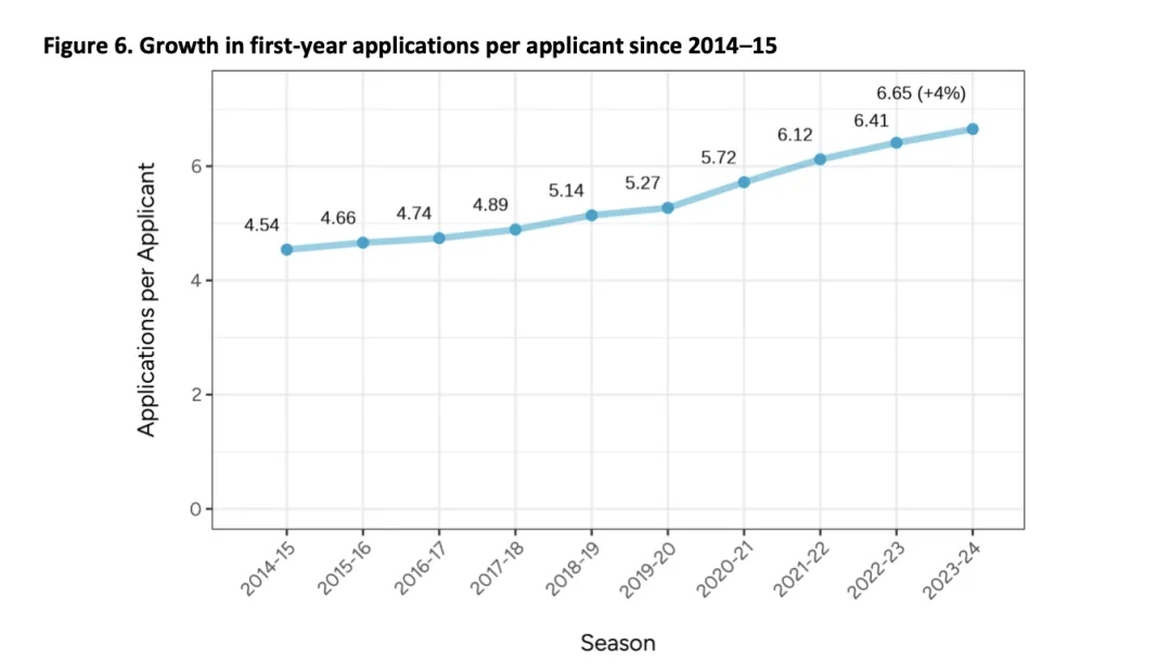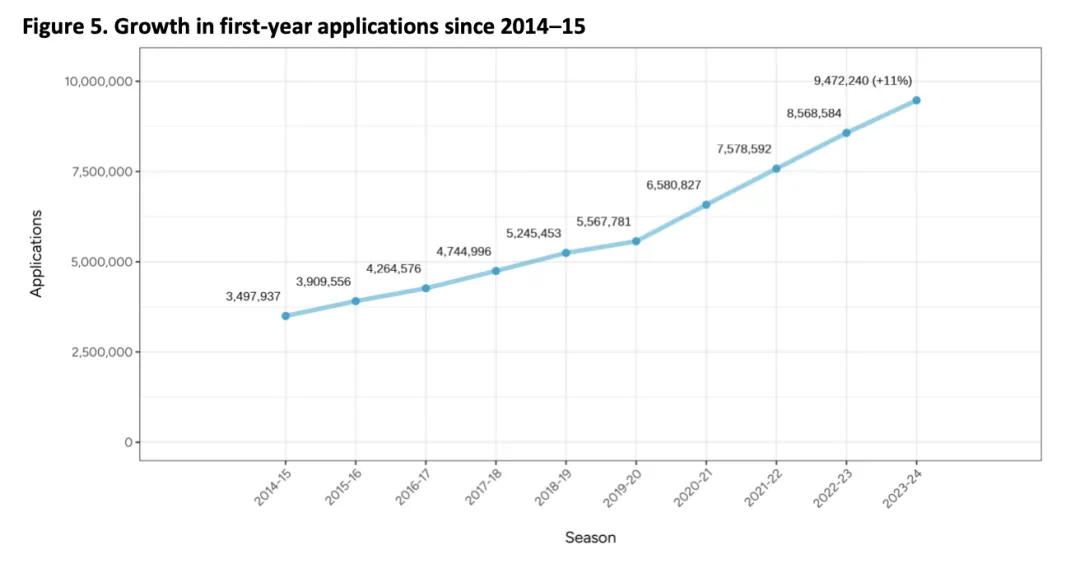按照这个数据算一下,人均申请份数从2022-23年度的6.41份来到了6.65份,增长了4%。看来越来越多的同学掌握了“广撒网”技能。