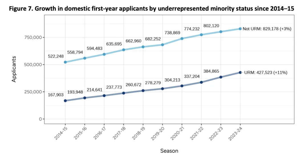 从申请者的族裔来看,少数族裔申请人(URM)的数量正在以超过非 URM的速度增长,自2022-23年以来增长了11%。