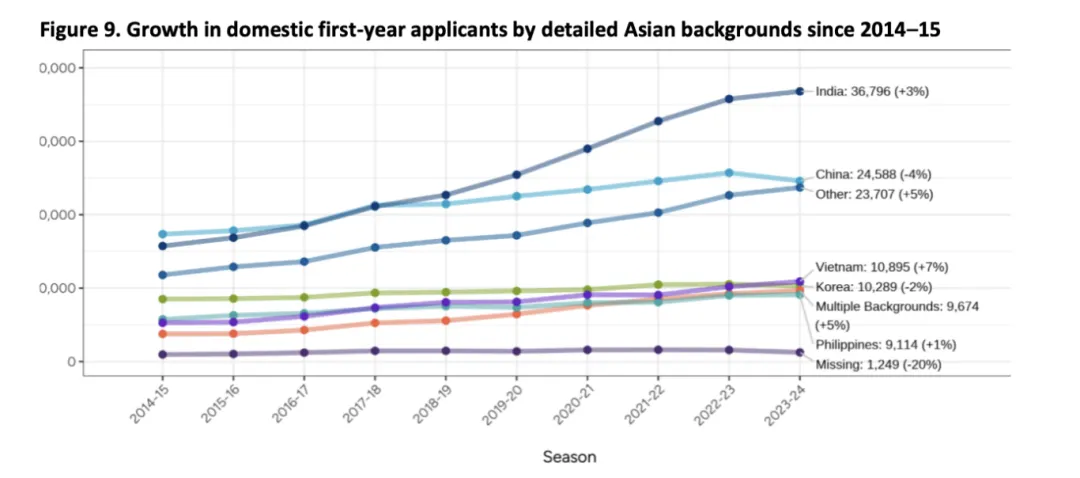 亚裔申请者中,印度背景的学生最多,有36,796人;其次是来自中国的学生,有24,588人。