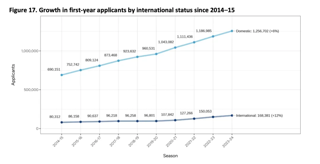 2023-24申请季共有168,381位国际申请者,涨幅为12%,是本土申请者涨幅的2倍。