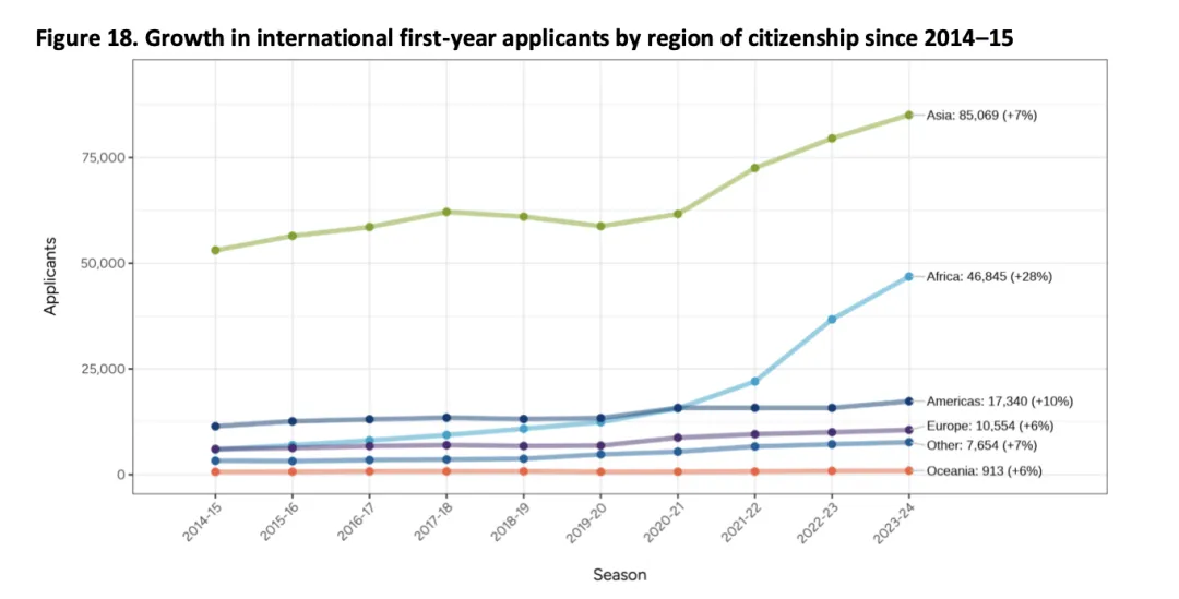 具体来看,尽管非洲学生的涨幅达到了惊人的28%,但国际生中最多的还是亚洲学生,为85,069人。