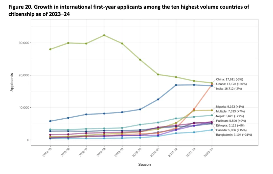 在所有国家中,加纳申请者的涨幅最快,来到了惊人的80%。