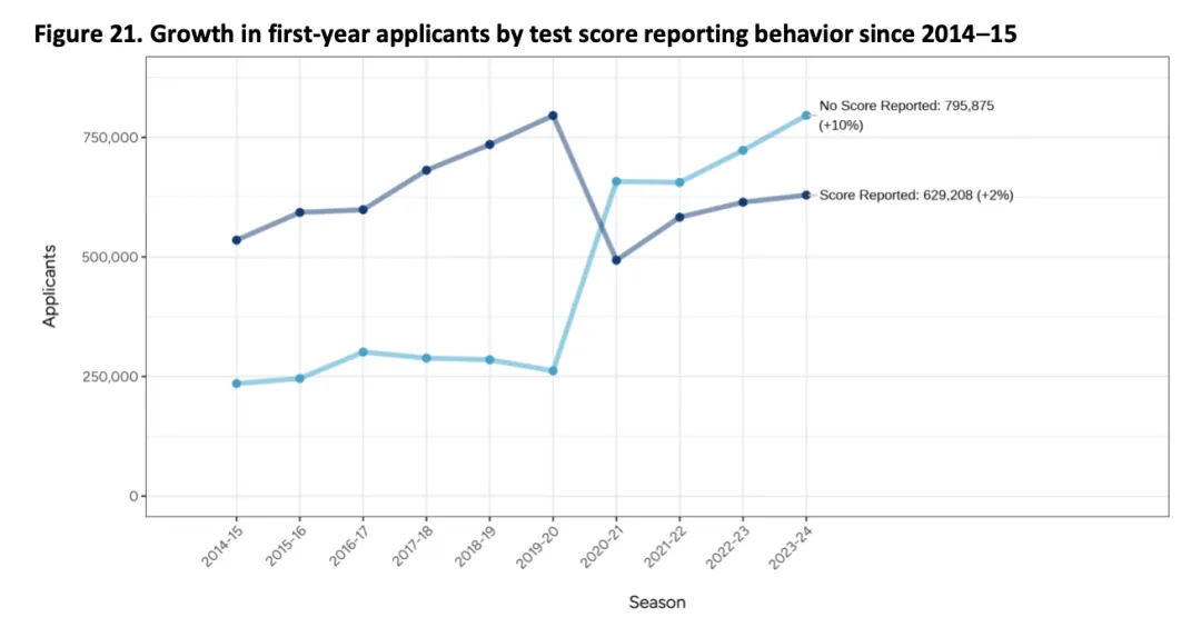 2023-24申请季,不交标化的学生有795,875人,涨幅为10%;相比之下交标化的学生只有629,208人,涨幅仅为2%。
