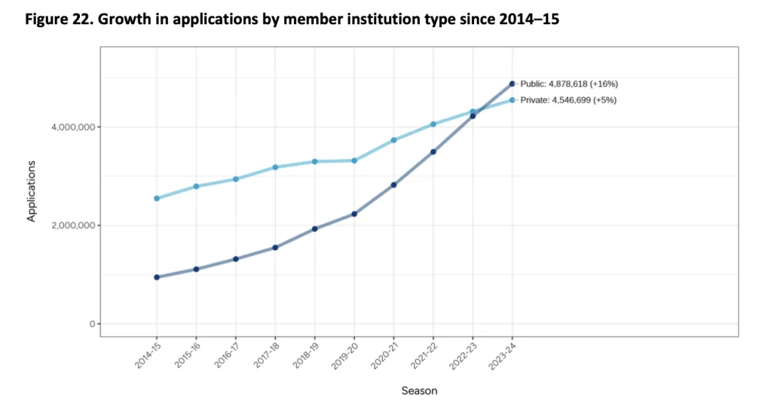 但是在2023-24申请季局势却发生了逆转,更多申请者都选择了公立大学,且公立大学申请者的增长为16%,远高于私立大学的5%。