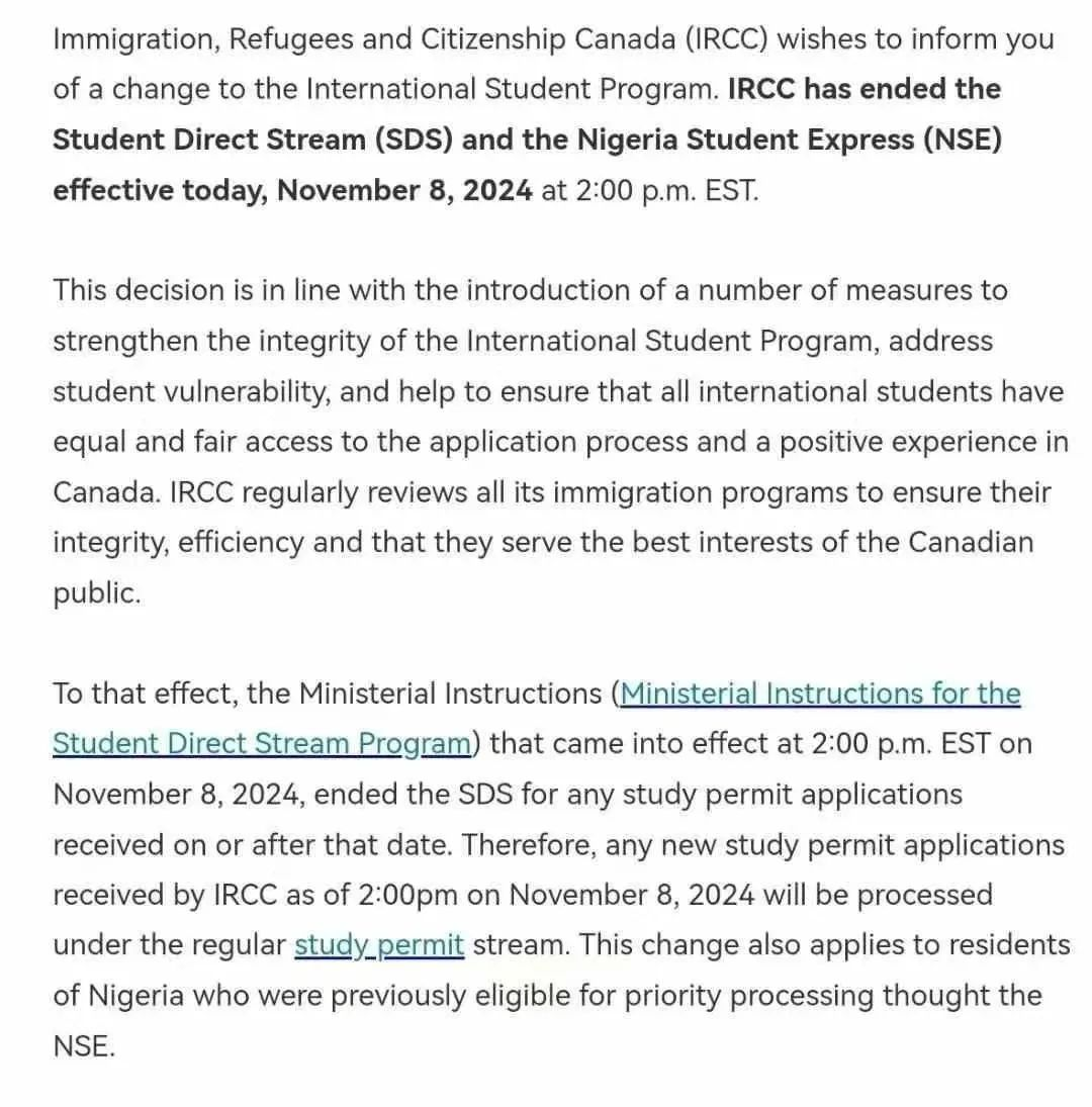 2024年11月8日,加拿大移民、难民和公民事务部(IRCC)又正式宣布,将不再接受通过“学生直入计划”(Student Direct Stream,简称SDS)提交的学习许可申请。同时,针对尼日利亚留学生的“Nigeria Student Express”(NSE)计划也将结束。未来,所有留学生申请人将需通过标准流程申请加拿大学习许可。
