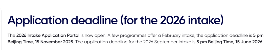 2026年2月入学申请现已经开放,可通过申请门户网站申请。报名截止时间为北京时间2025年11月15日下午5点。 为了确保顺利申请,强烈建议尽早提交申请,名额有限,先到先得。