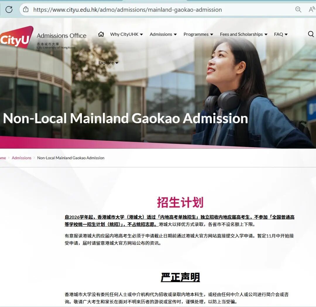 重磅消息!香港城市大学宣布:2026学年起,将通过“内地高考单独招生”独立招收内地应届高考生,不再参与“全国普通高等学校统一招生计划(统招)”,且不占用统招志愿。这意味着,港城大的招生模式将迎来重大变革,对2026年及以后的高考生影响深远。