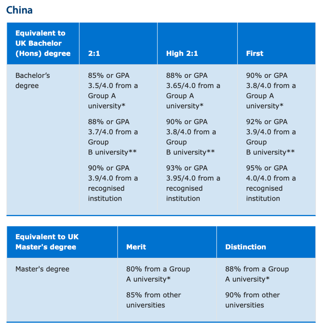此次更新,剑桥大学将中国大陆的本科院校划分为三个层次:Group A大学、Group B大学、以及其他被认可的院校 (recognised institution)。针对这三个不同层次的院校,剑桥给出了差异化的学术成绩要求。